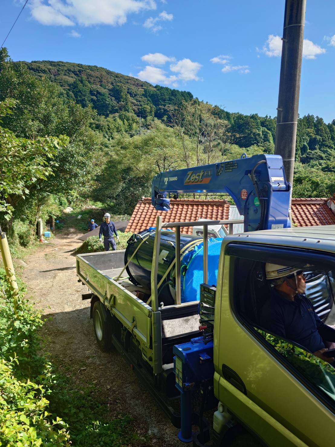 搬入経路が険しい山道だったので、誘導員を配置しそれに従い慎重に搬送を行いました。